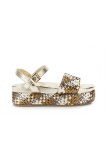 Sandali platform effetto pelle laminata con intreccio multicolor oro bronzo e platino oppure bianco oro e argento. fondo alto e fascetta regolabile per comfort e stile. suola alta 3.5 cm. perfette per look estivi brillanti e super versatili.