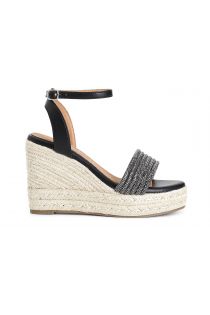 Sandali con mignons strass a decoro sulla tomaia. zeppa in corda di 10.5 cm e plateau di 3.5 cm. cinturino alla caviglia. soletto in pelle.