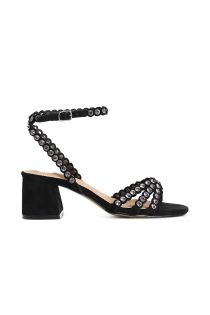 Sandali con strass. tacco medio. cinturino e fibbia regolabile alla caviglia.