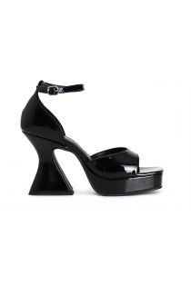 Sandali effetto vernice con toppone e cinturino alla caviglia. tacco alto a rocchetto alto 90mm e plateau. calzatura comoda caratterizzata dalla punta quadrata. tomaia semplice e avvolgente.