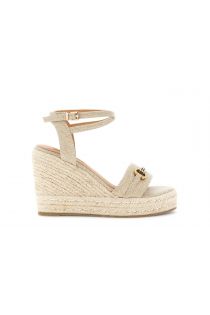 Sandali con zeppa in corda intrecciata caratterizzait da tomaia morbida con fascia frontale e cinturino alla caviglia con chiusura regolabile.plateau alto 2 cm e suola alta 8 cm. dettaglio decorativo sul davanti plantare confortevole e suola stabile pensata per accompagnare i movimenti con leggerezza. ideale per un’eleganza quotidiana dal gusto naturale.