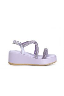 Sandali incrociati con fasce ricoperte da microstrass. una comoda e ampia zeppa con soletto imbottito fasciato in nappa.