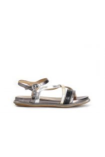 Sandali bassi in similpelle laminata con intreccio multicolore.