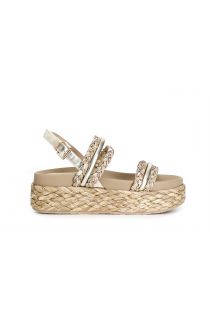 Sandali frate color block in raffia intrecciata con inserto strass. comodo footbed e la zeppa è fasciata in raffia.