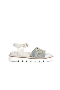 Sandali modello gilda in tessuto denim arricchito da strass e borchie. la zeppa è alta 2.9 cm. una calzatura che unisce stile praticità e versatilità. calzature perfette per l'estata da indossare con gonne lunghe e ampie.