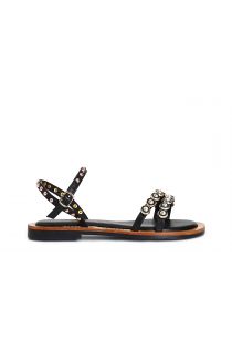 Sandali modello gilda in nappa con borchie e strass. la fodera e il soletto sono in pelle. il tacco è alto h. 1.5 cm. calzatura comoda anche dopo svariate ore di utilizzo e perfetta da abbinare a molteplici look.