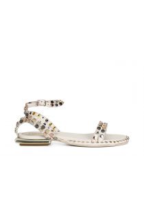 Sandali modello gilda in pelle con borchie multicolor. la forma particolare del tacco rende la calzatura super chic e super glamour. la fodera e il soletto sono in pelle. tacco alto h. 2 cm. comodi da indossare e facili da abbinare.