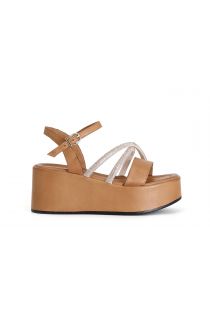 Sandali modello gilda con listelli microstrass su zeppa fasciata in pelle.