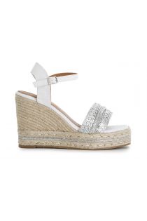 Sandali modello gilda in rafia e inserto in microstrass. zeppa corda impreziosita da una fascia in microstrass.