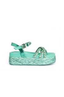 Sandali modello gilda color block con tre fasce in raffia intrecciate tra loro e con inserto in strass. comodo footbed e la zeppa è fasciata in raffia.