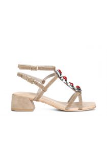 Sandali in camoscio con pietre motivo a "t". doppio cinturino. fodera e soletto sono in pelle. forma squadrata. il tacco è di 4.5 cm.