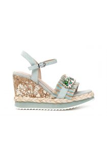 Sandali in camoscio e rafia sfrangiata multicolor con accessorio strass e perline in legno su zeppa multimateriale.