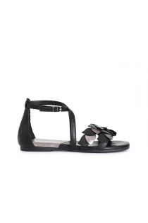 Sandali bassi in pelle chiusi dietro e con doppia fascia cinturino incorciato che si lega alla caviglia. decoro bicolor frontale simile ad un intreccio di foglie.