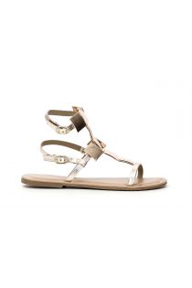 Sandali in pelle con accessori squadrati in metallo. Il soletto è in pelle con particolari borchie flat sulla dima davanti. La suola in gomma molto flessibile.
