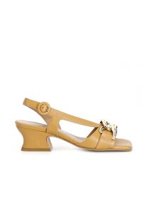 Sandali asimmetrici in pelle con accessorio catena dorata e tacco a rocchetto bold.