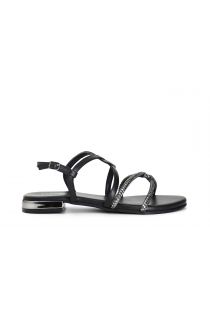 Sandali in pelle con tomaia incrociata e strass termosaldati. fodera e soletto sono in pelle. il tacco è di 1.6 cm.