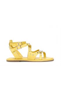 Sandali in pelle doppio incrocio e borchie, guardolo fasciato in pelle.