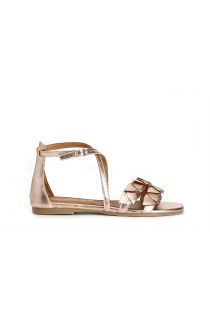 Sandali bassi in pelle laminata chiusi dietro e con doppia fascia e cinturino incorciato che si lega alla caviglia. decoro frontale simile ad un intreccio di foglie.