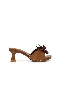 sandali in pelle scamosciata con fascia decorara e fiore in 3d. tabacco