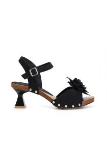 Sandali in pelle scamosciata con fiore 3d e cinturino alla caviglia. tacco a clessidra dello stesso colore della fascia.