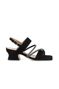 Sandali frate con due fasce pelle scamosciata e due listelli in microstrass. tacco a rocchetto bold.