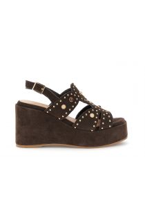 Sandali in pelle scamosciata su zeppa di 9 cm impreziosito da borchie e cabochon per un look grintoso. con soletto in pelle offre comfort e stile ideale per outfit estivi cool e ricercati.