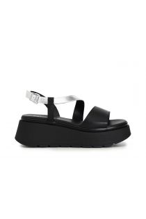 Sandali bicolor in pelle con listino asimmetrico su zeppa.