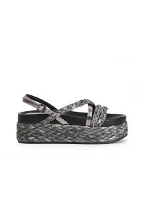 Sandali asimmetrici color block in raffia intrecciata con inserto strass. comodo footbed e la zeppa è fasciata in raffia.