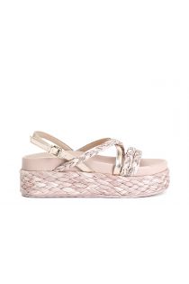 Sandali asimmetrici color block in raffia intrecciata con inserto strass. comodo footbed e la zeppa è fasciata in raffia.
