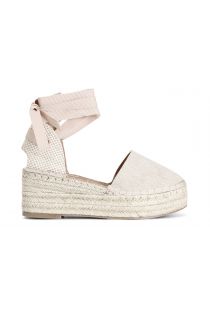Sandali in tessuto con allacciatura alla schiava su zeppa in corda.