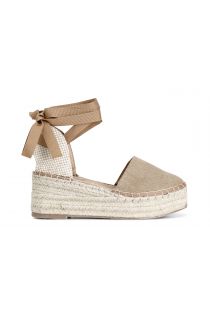 Sandali in tessuto con allacciatura alla schiava su zeppa in corda.