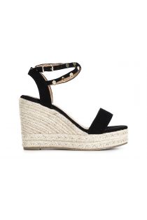 Sandali in tessuto su zeppa in corda e plateau. cinturino alla caviglia con borchie dorate.
