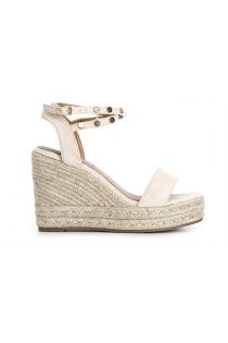 Sandali in tessuto su zeppa in corda e plateau. cinturino alla caviglia con borchie dorate.