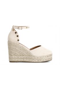 Sandali in tessuto su zeppa in corda e plateau. cinturino alla caviglia in tessuto. calzatura chiusa davanti e dietro. borchie dorate sul toppone e sul cinturino.