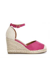 Sandali in tessuto su zeppa in corda. cinturino alla caviglia in tessuto. calzatura chiusa davanti e dietro.
