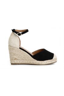 Sandali in tessuto su zeppa in corda. cinturino alla caviglia in tessuto. calzatura chiusa davanti e dietro.