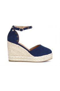 Sandali su zeppa in corda con cinturino alla caviglia in tessuto chiuso davanti e dietro con borchie dorate.
