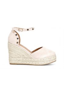 Sandali su zeppa in corda con cinturino alla caviglia in tessuto chiuso davanti e dietro con borchie dorate.