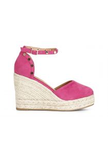 Sandali su zeppa in corda con cinturino alla caviglia in tessuto chiuso davanti e dietro con borchie dorate.