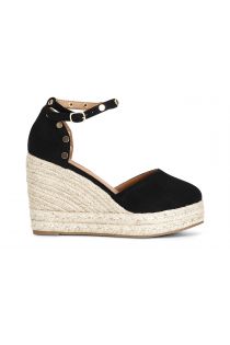 Sandali su zeppa in corda con cinturino alla caviglia in tessuto chiuso davanti e dietro con borchie dorate.