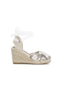 Sandali con zeppa e plateux in corda realizzata in tessuto ricamato e laccio alla schiava.