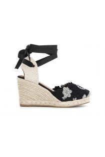 Sandali con zeppa e plateux in corda realizzata in tessuto ricamato e laccio alla schiava.