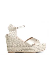 Sandali in tessuto con due fasce incrociate. plateau alto 30 mm e zeppa in corda di 90 mm.