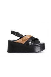Sandali incrocio bicolor su zeppa fasciata in pelle.