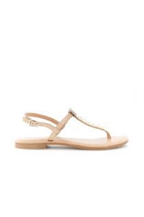 Sandali infradito flat con listini sottili e cinturino regolabile alla caviglia. la fascia centrale è arricchita da perle decorative e fibbia gioiello. soletto in pelle confortevole e suola flessibile alta 1.4 cm. calzatura ideale per look estivi curati ma facili.