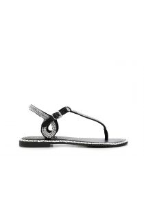 Sandali infradito con microstrass sfumati e con particolare infilatura in raffia a contrasto lungo il perimetro del soletto in pelle.