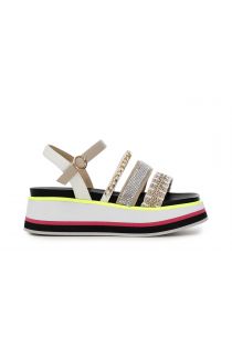 Sandali multistini con catena e microstrass, suola in micro multistrati colorati e comodo fusbett.