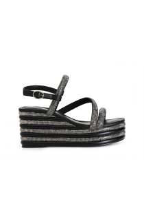 Sandali con fasce con strass. zeppa caratterizzata da fasce di strass alternati. il comodo soletto imbottito in vera pelle fa risultare la calzatura comoda anche dopo svariate ore di utilizzo. il tacco è alto 70mm il plateau invece è di 35mm.