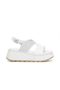 sandali asimmetrico in pelle bicolor e glitter su zeppa.