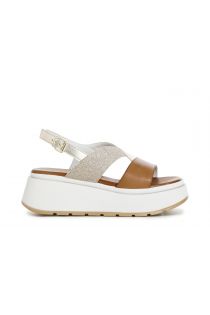 sandali asimmetrico in pelle bicolor e glitter su zeppa.